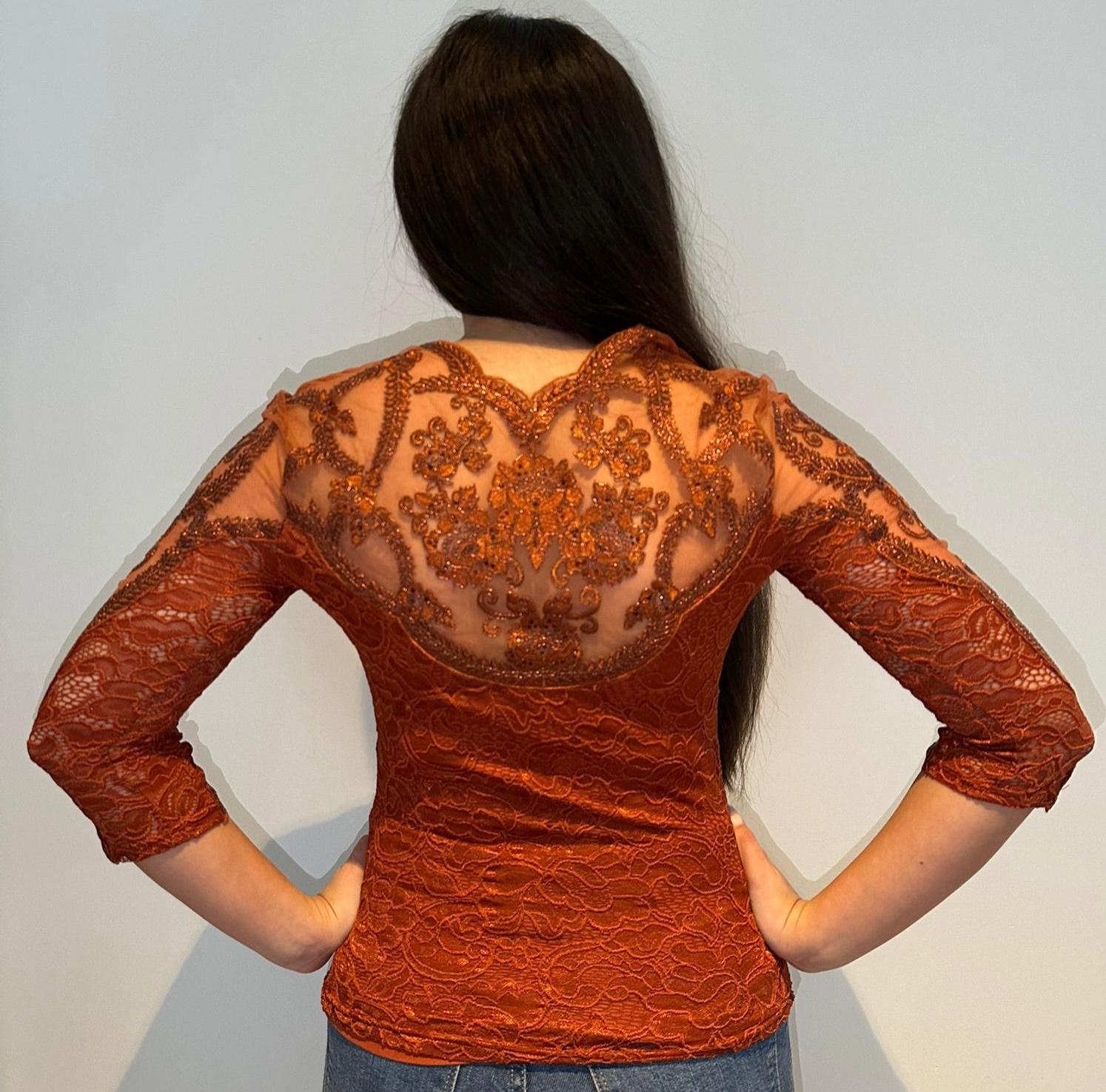 Réchauffez votre garde-robe avec la nuance la plus solaire de notre nouvelle collection. Ce body couleur Brique (ou Terracotta) est une invitation au voyage et à la douceur. Entre élégance bohème et chic urbain, cette teinte organique sublime naturellement le teint et apporte une profondeur unique à vos tenues de saison. Une Dentelle Artisanale & Lumineuse : Nuance Cuivrée Vibrante : Un coloris brique riche, aux reflets chauds, qui change d’intensité selon la lumière. Broderies Florales Étincelantes : La dentelle est travaillée avec un souci du détail extrême, mêlant motifs floraux traditionnels et finitions contemporaines pour un relief saisissant. Transparence Raffinée : Les manches 3/4 et le haut du buste jouent sur un tulle léger qui laisse entrevoir la peau avec subtilité, orné de broderies qui semblent suspendues. Encolure Festonnée Signature : Un décolleté en V gracieux, souligné par des bordures en dentelle délicatement découpées à la main.